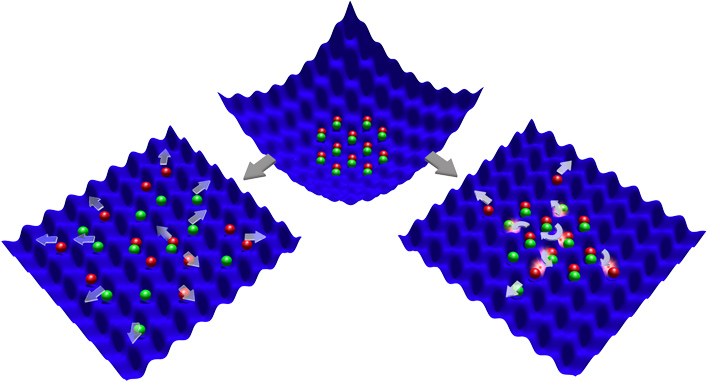 Abb.1: Eine eingeschlossene dichte Wolke aus fermionischen Atomen in einem optischen Gitter (oben) wird plötzlich freigelassen; (links) zeigt die anschließende Bewegung im Gitter für Atome ohne Wechselwirkung, (rechts) für Atome mit Wechselwirkung. Quelle: Grafik: MPQ (idw)
