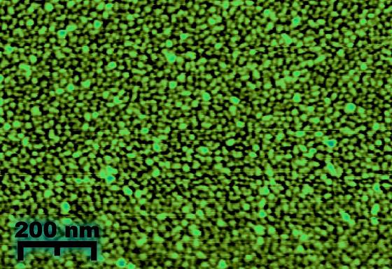 Gold-Nanopartikel auf einer Glasoberfläche aufgenommen mit einem Rasterkraftmikroskop. Schematisch die Metallpartikel nahe der so genannten Perkolationsschwelle.