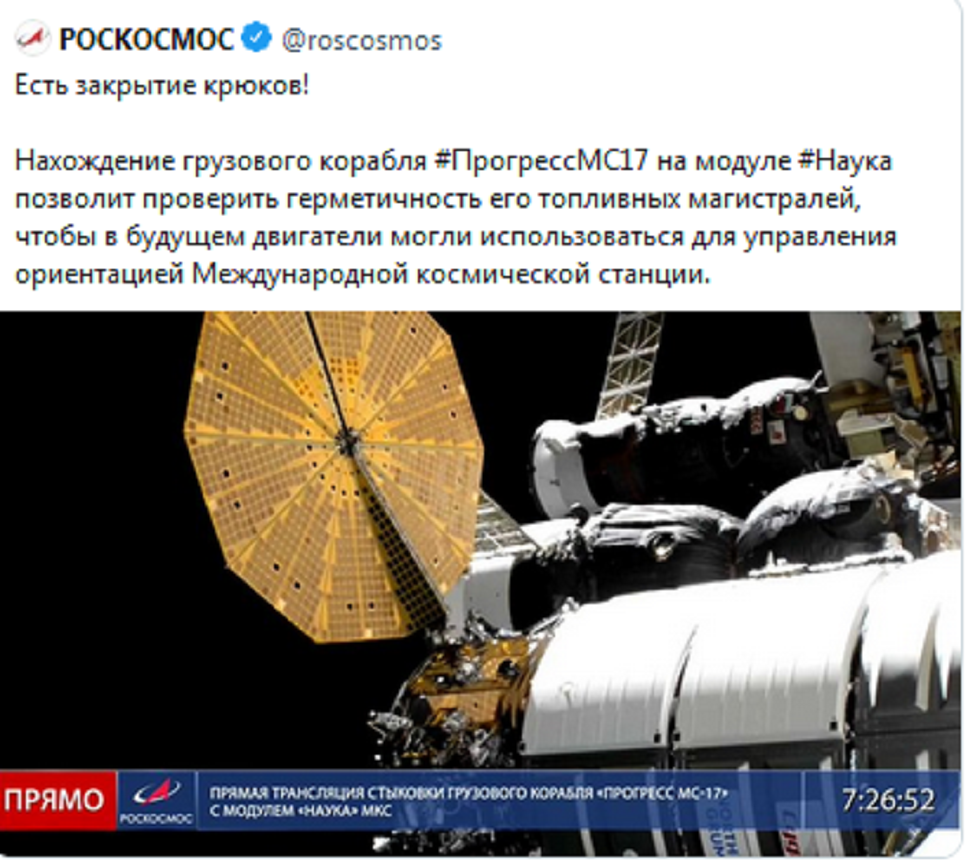 Zurück zu „Progress“-Raumschiff koppelt sich erfolgreich an ISS-Modul „Nauka“ an