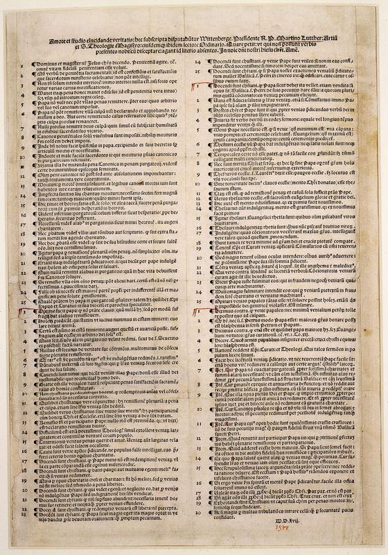 95Thesen.jpg = Plakatdruck der 95 Ablassthesen (Nürnberg, Hieronymus Höltzel, vor Ende 1517) Quelle: Staatsbibliothek zu Berlin – Preußischer Kulturbesitz, Signatur: gr. 2° Luth. 54, Antrag, Position d) (idw)
