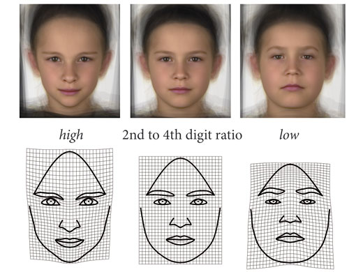 Morphs (oben) und sogenannte Deformationsgitter (unten) zeigen die Gesichtsformen von Buben, die mit hohem, durchschnittlichem und niedrigem (von links) Fingerlängenverhältnis assoziiert sind. Quelle: (Quelle: Sonja Windhager, Katrin Schäfer) (idw)