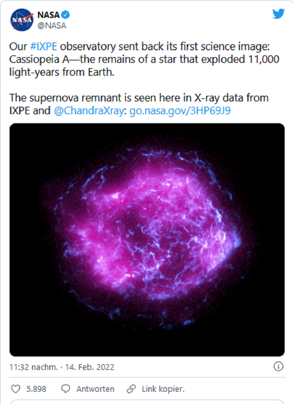 Zurück zu Nasa-Teleskop IXPE sendet das erste Bild zurück: Supernova aus dem 17. Jahrhundert