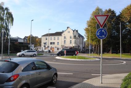 Kreisverkehre erleben in den letzten Jahrzehnten auch in Deutschland eine Renaissance. Das runde, blaue Verkehrszeichen mit den drei weißen Pfeilen und das Schild "Vorfahrt gewähren" kennzeichnen zusammen einen Kreisverkehr. Bild: "obs/TÜV Rheinland AG"