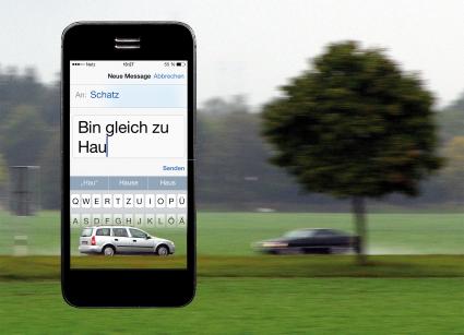 Gefährliche Begegnung auf der Landstraße: Der eine schaut auf sein Handy, textet, ist im "Blindflug" unterwegs. Der andere ist ahnungslos und sieht die tödliche Gefahr nicht kommen. Das Unfallrisiko erhöht sich beim Schreiben und Lesen einer SMS laut Deutschem Verkehrssicherheitsrat (DVR) auf das 23-fache. Viele Autofahrer unterschätzen das Risiko. Bild: "obs/Deutscher Verkehrssicherheitsrat e.V./Fotocollage DVR / Fotolia"
