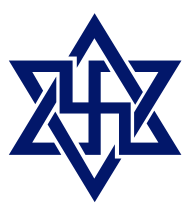 Symbol des Raelismus: Männliche und Weibliche Energie im Gleichgewicht mit dem Glückssymbol (Swastika/Hackenkreutz) in der Mitte.