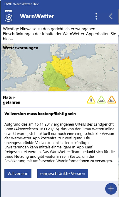 Landgericht Bonn untersagt DWD kostenfreie Abgabe der WarnWetter-App