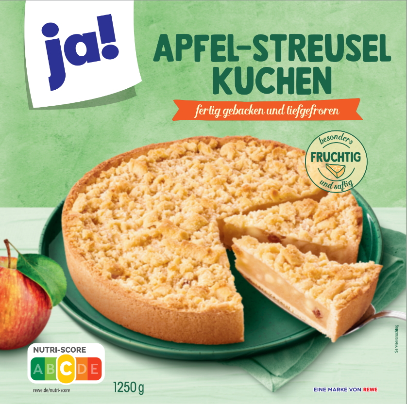 Zurück zu Rückruf ja! Apfel-Streuselkuchen, 1250g, mit dem Mindesthaltbarkeitsdatum 05/2026 und Charge 5036