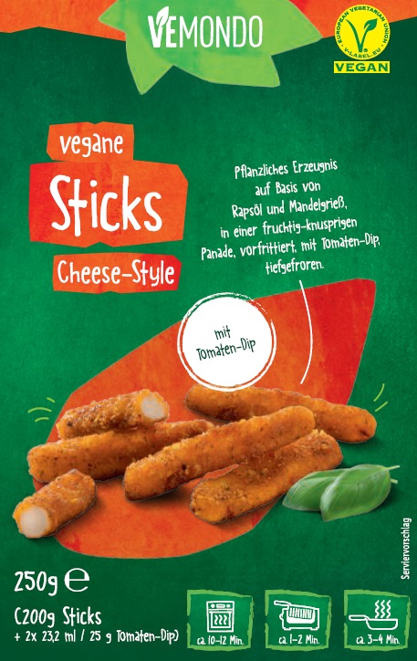 "Vemondo Vegane Sticks Cheese-Style, 250g". Bild: Lidl Fotograf: Lidl