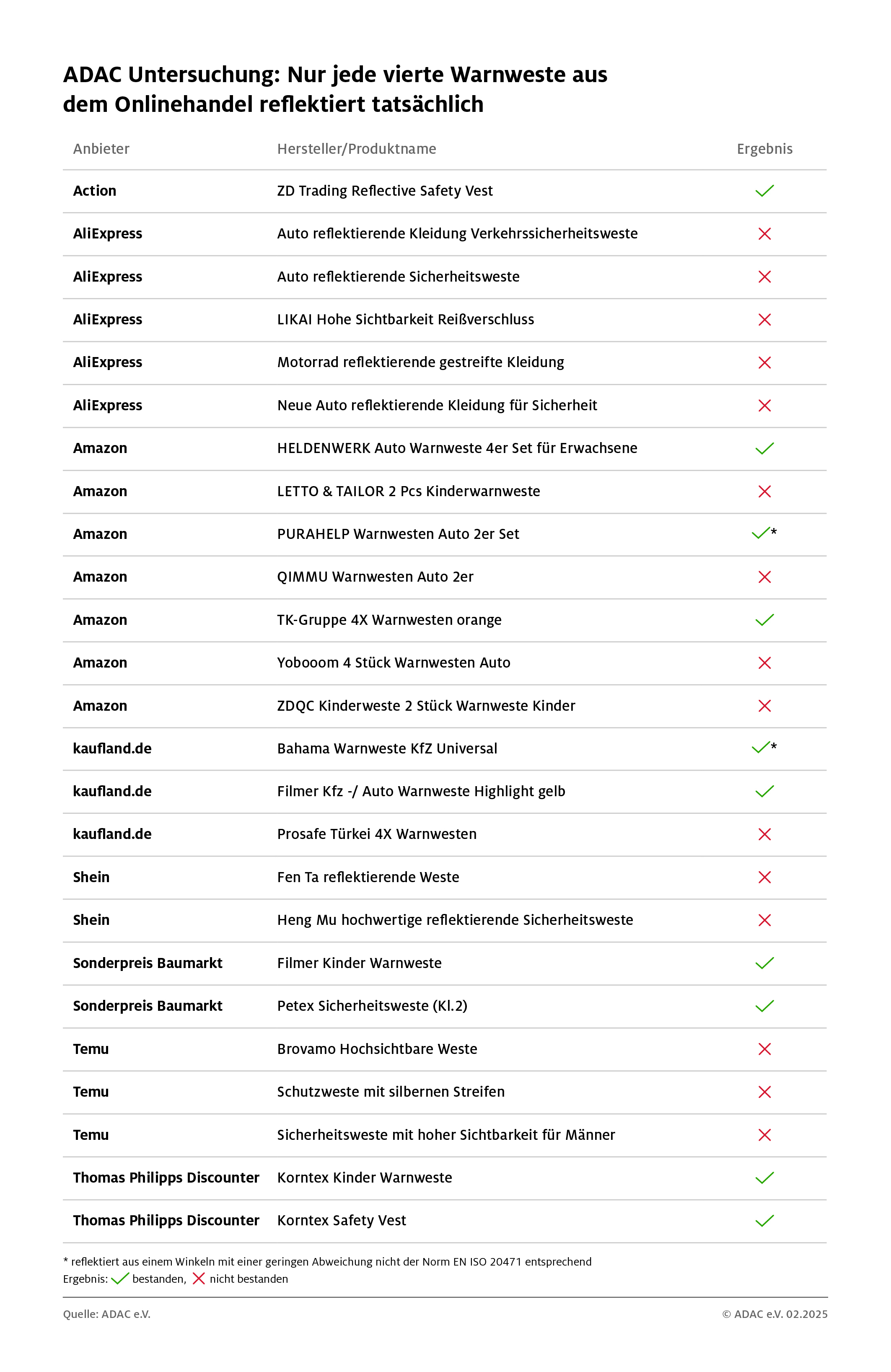 Zurück zu ADAC Untersuchung: Nur jede vierte Warnweste aus dem Onlinehandel reflektiert
