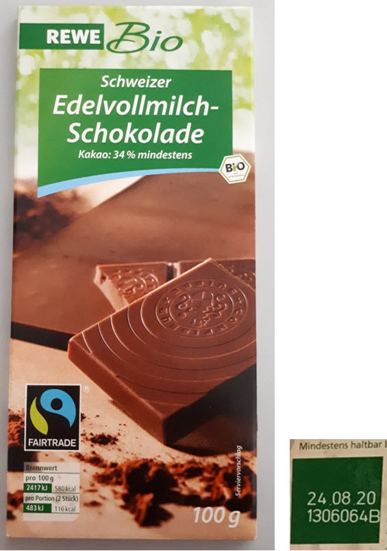 REWE Bio Schweizer Edelvollmilchschokolade 100g LOT 1306064B. Bild: "obs/SC Swiss commercial GmbH"