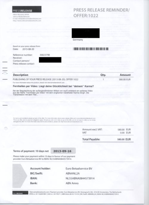 Ein als Rechnung getarntes Angebot der Firma Firma Silence Media Network, das ein Redakteur von ExtremNews erhalten hat..