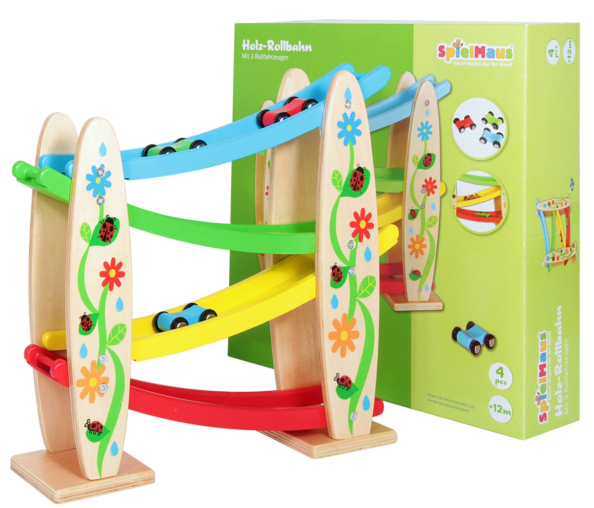 Holz-Rollbahn mit 3 Rollfahrzeugen von SpielMaus Holz Bild: "obs/VEDES AG"