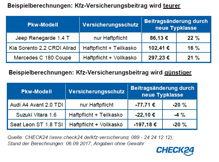 Beispielberechnungen: Kfz-Versicherungsbeitrag wird teurer bzw. günstiger / Bild: "obs/CHECK24 Vergleichsportal GmbH/CHECK24.de"