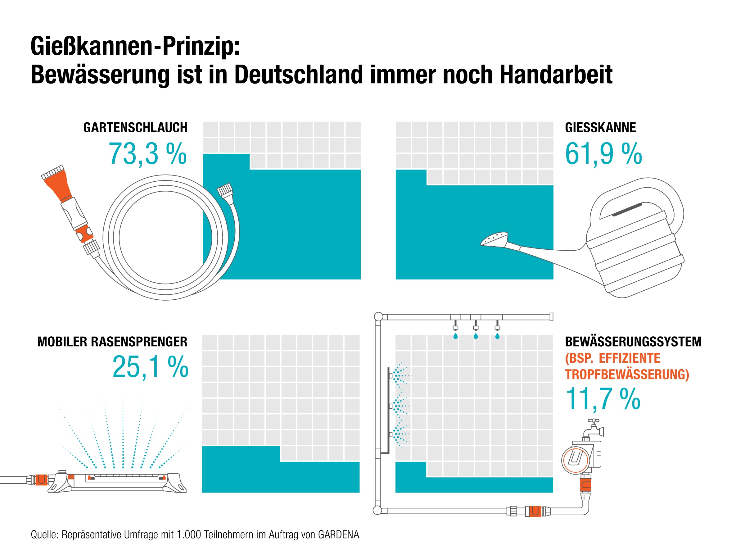 Die Mehrheit der Gärtner bewässern noch per Hand und nur Wenige setzen bereits auf flexible Bewässerungssysteme, wie die effiziente Tropfbewässerung.