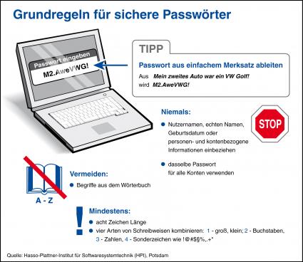 Fünf Grundregeln für sichere Passwörter empfiehlt das Potsdamer Hasso-Plattner-Institut (HPI) zu beachten. Grafik: HPI.