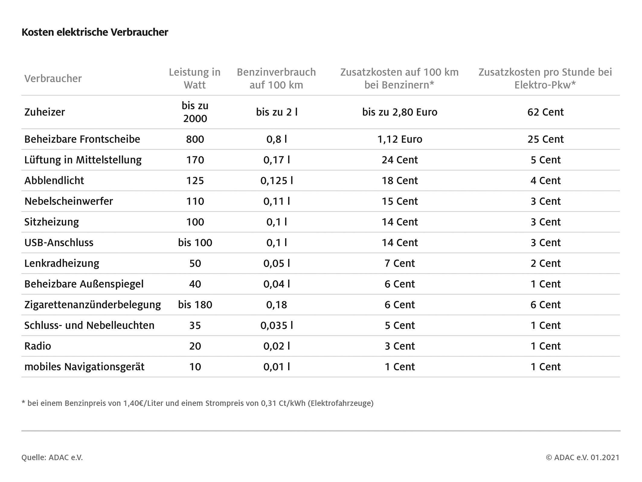 Kraftstoff- bzw. Stromkosten der einzelnen elektrischen Verbraucher im Auto. Bild: "obs/ADAC/@ADAC"
