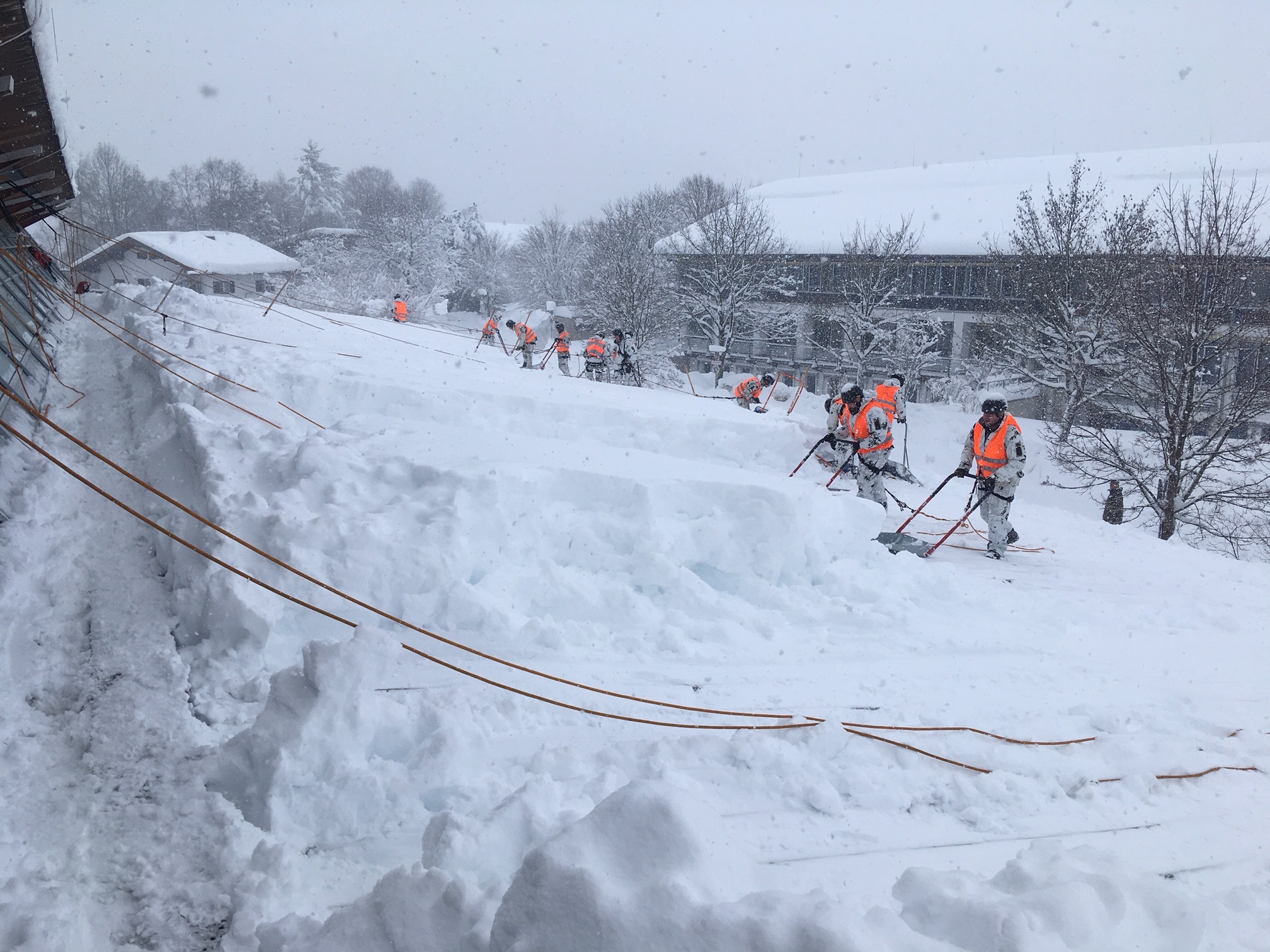 Soldaten der Gebirgsjägerbrigade 23 Bad Reichenhall räumen das Dach der Grund- und Mittelschule Miesbach
