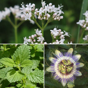 Baldrian, Melisse und Passionsblume. Bild: wikimedia/NobbiP, wikimedia/Jamain
