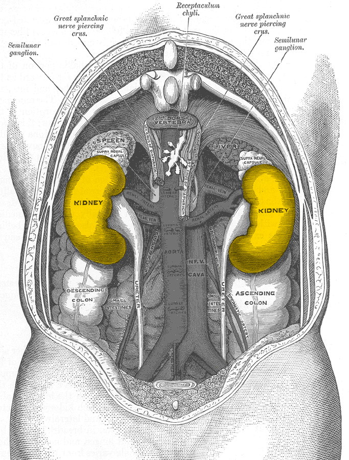 Lage der Nieren, gesehen von hinten. Die Farbe hat Symbolcharakter und entspricht nicht der Realität.
