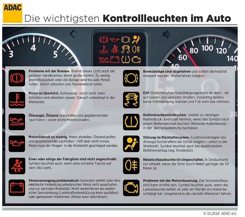 Die wichtigsten Kontrollleuchten im Auto. Bild: ADAC
