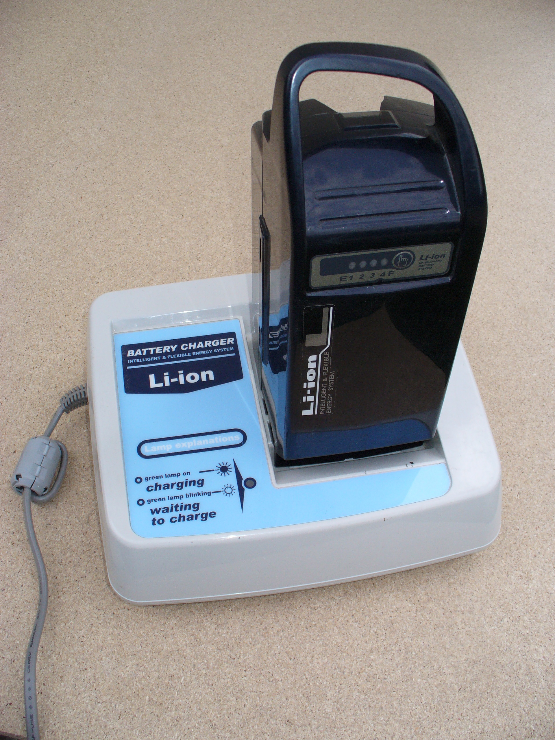 Elektrofahrrad: Entnehmbarer Pedelec-Akkupack aus Lithium-Ionen-Akkumulatorzellen im Ladegerät